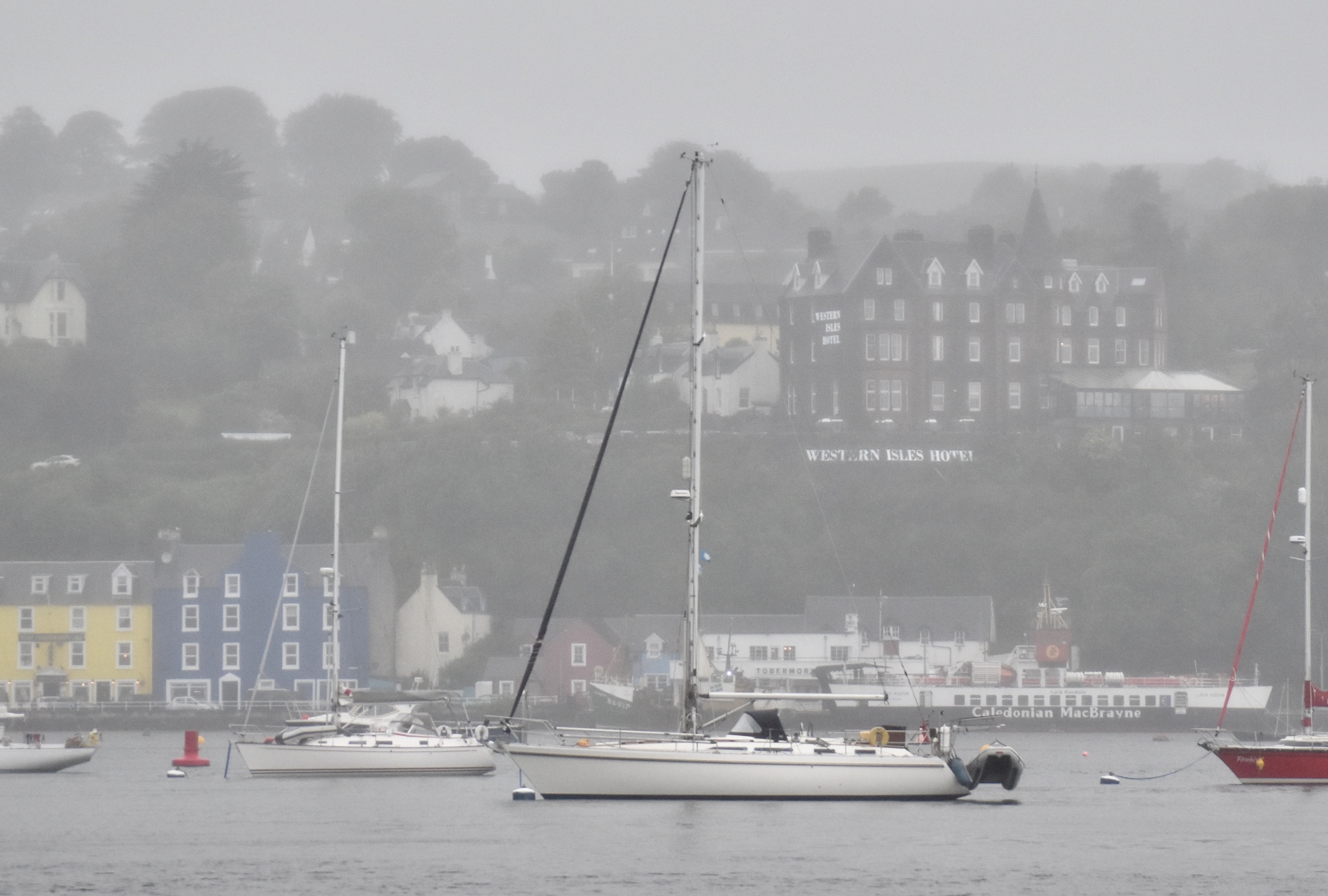A thorough blast of Scottish spring weather didn’t dampen spirits on the Law Society Yacht Club’s second Hebridean cruise. Skipper Michael Cross was joined by five other club stalwarts in the Westerly 38 Clear Blue, chartered from Alba Sailing, near Oban Argyll. Because of the dismal weather forecast we curtailed our offshore ambitions for the week-long cruise, deciding instead to explore some interesting rocky anchorages. However we also managed a couple of days exploring the colourful delights of Tobermory before a night sail home.